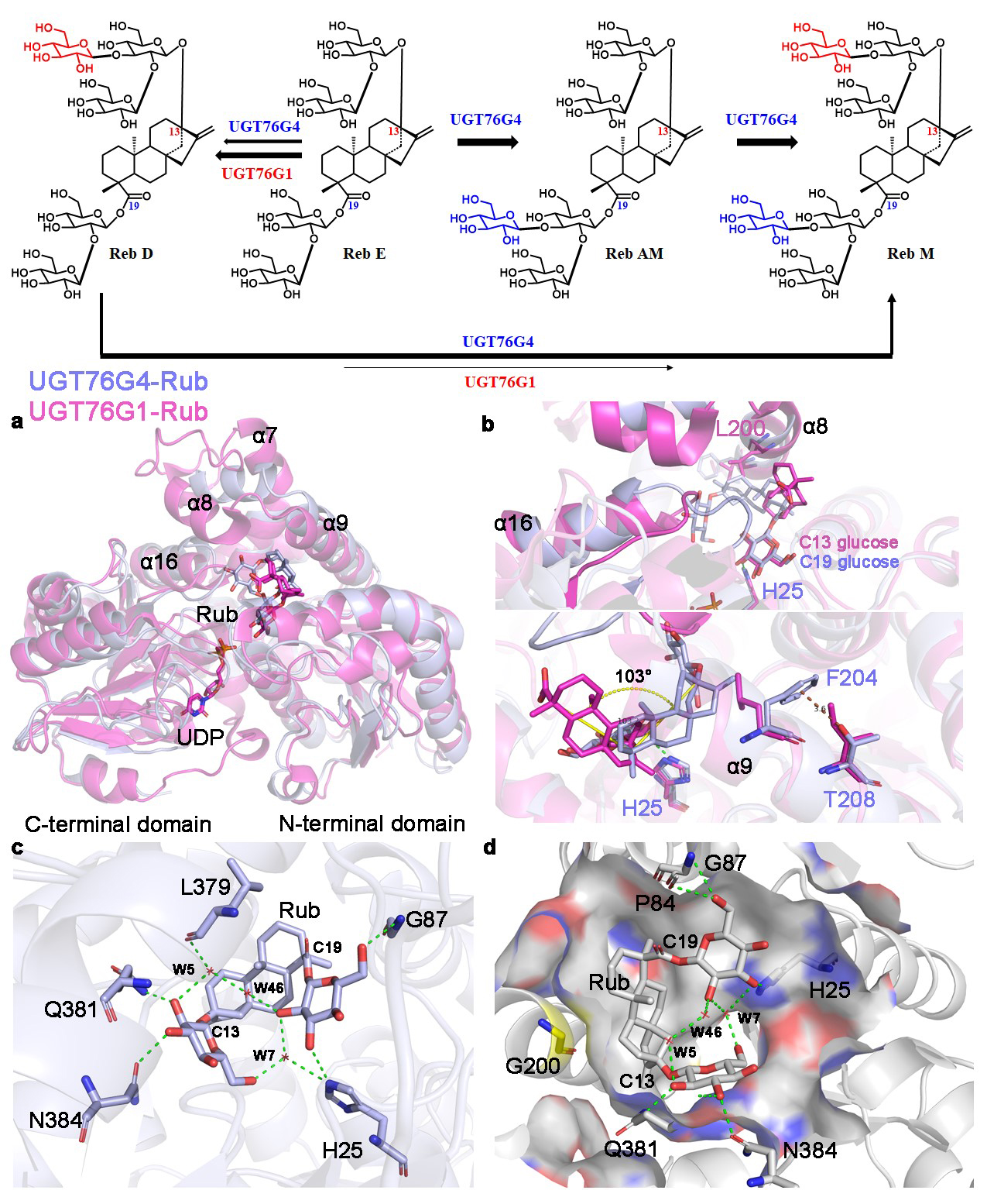近日,我所生物技术研究部天然产物及糖工程研究组(1805组)尹恒研究员团队在天然产物合成生物学研究中取得新进展,解析了甜叶菊中负责莱鲍迪苷(Rebaudioside)D(Reb D)向莱鲍迪苷M(Reb M)转化的关键糖基转移酶UGT76G4,揭示了该酶底物区域选择性的分子机制,并基于此通过半理性设计改造,获得了多个可用于高效合成Reb M的工具酶。