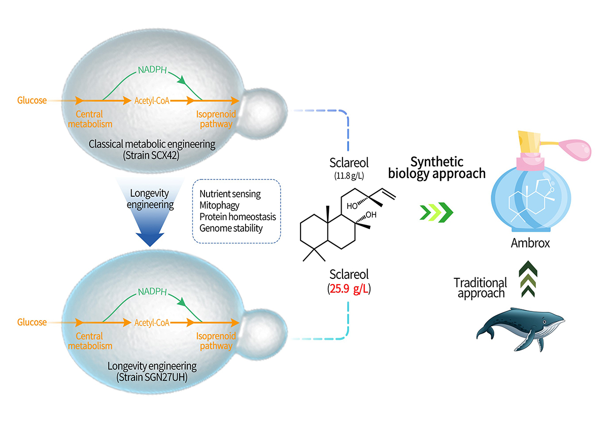 香紫苏醇是一种来源于香紫苏的二萜醇类化合物,在医药和农药领域具有重要的生物活性,且是合成高级香料降龙涎醚的主要原料。研究团队前期通过全局调控中心代谢途径,将香紫苏醇产量提升至11 g/L(Metab. Eng.,2023)。然而,在长期的补料分批发酵过程中,细胞老化和有毒代谢物积累所引起的代谢应激反应,限制了细胞的生产性能。因此,通过提高酵母的寿命,有望提升细胞生物合成能力。